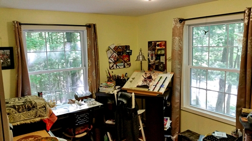 I am fortunate to have a small spare bedroom that is converted in to a studio .  Tons of art supplies stuffed in to buffets and hutches. All ” my specials ” are kept displayed on the hutch – as they inspire me.  Bird’s nests and Robbin’s eggs, feathers and crystal rocks. Hand made gifts and ornaments that my family has given to me. They remind me of who I am.   I have my Painting easel displayed between two windows that look out in to the forest . My Art studio feels like a tree house to me . A herd of deer is a daily sight, and several times a season I will see a bear moseying by. Last year he spent an entire hot lazy day just lounging at the base of a tree,  possibly a whole 20 ‘ away – with not a care in the world..